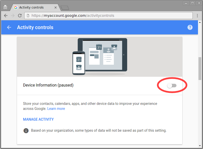 Even if your student doesn't use a Chromebook, they may have a Google Apps for Education (GAFE) account, which is essentially a Google account provided by the school. GAFE accounts can be accessed from any browser, and the privacy settings affect your student regardless of which browser they use to log in to GAFE. In order to maximize your child's privacy, we advise changing the settings below.
