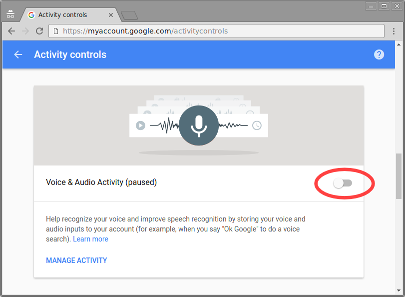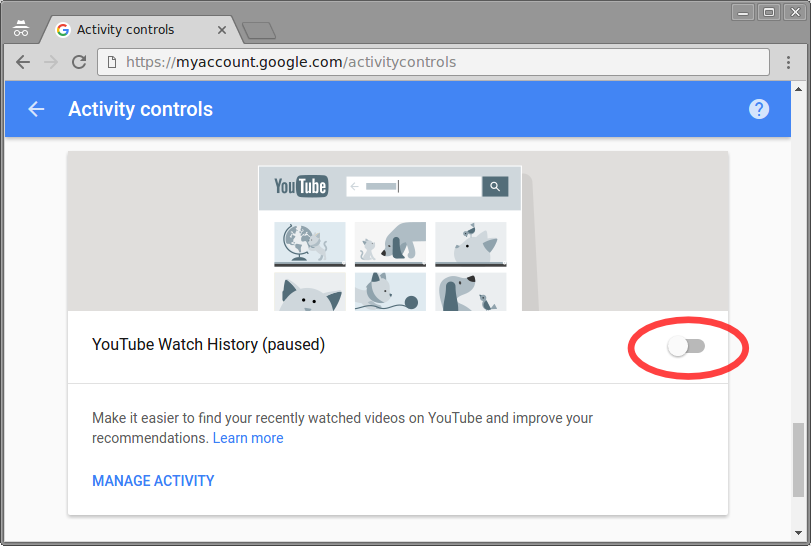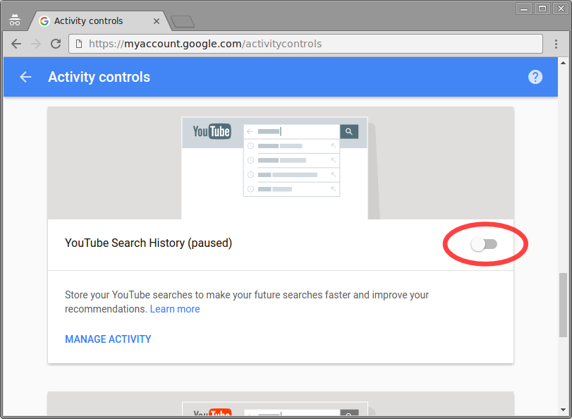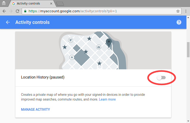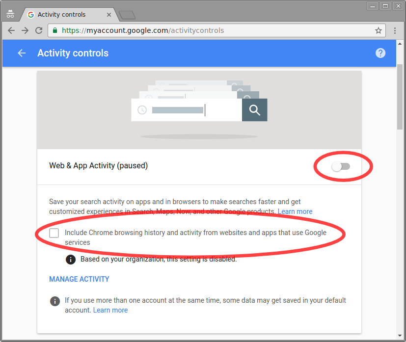 Using any web browser, open the URL https://myaccount.google.com/activitycontrols and make sure you are signed in to your Google account. Then, make sure all the slider/toggles are to the left ("paused"). If a confirmation box pops up asking you to confirm that you want to pause an activity, confirm it by clicking "Pause". Additionally, under "Web & App Activity", uncheck "Include Chrome browsing history and activity from websites and apps that use Google services." (Also, note that depending on your school's settings, not all of the slider/toggles may be available for your account.)