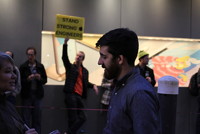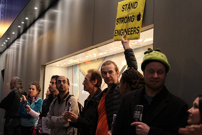 Dozens of people gathered at the Apple Store in San Francisco this evening to shout their support for the company's position defending privacy and security in the face of irresponsible government demands.