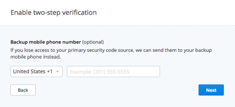 Regardless of the method you chose, you can finish up by choosing an (optional) backup phone number at which you can receive texts if you can’t access your authenticator app or primary phone number.