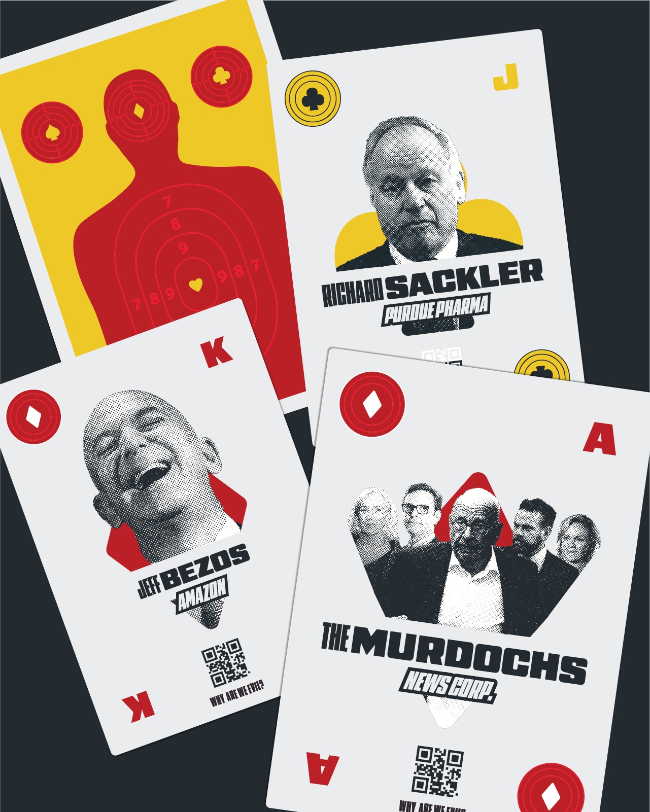 Las cartas de los CEO más buscados no hacían referencia a Mangione, y los naipes -que aún no se han publicado- no incluirían información personal sobre ningún CEO. En sus mensajes iniciales sobre las cartas, Harr dijo que planeaba incluir códigos QR con más información sobre cada empresa y, en su opinión, qué peligros presentan las empresas. Cada traje representaría una industria diferente, y el reverso de cada tarjeta incluiría una silueta genérica al estilo de un campo de tiro. En palabras de Harr en su vídeo, ahora retirado, las tarjetas incluirían "la persona, de qué forma parte y un código QR que lleva a páginas dedicadas que explican por qué son malvadas. Por ejemplo: '¿Por qué es malvado el director general de Walmart? ¿Por qué es malvado el presidente de Northrop Grumman?".