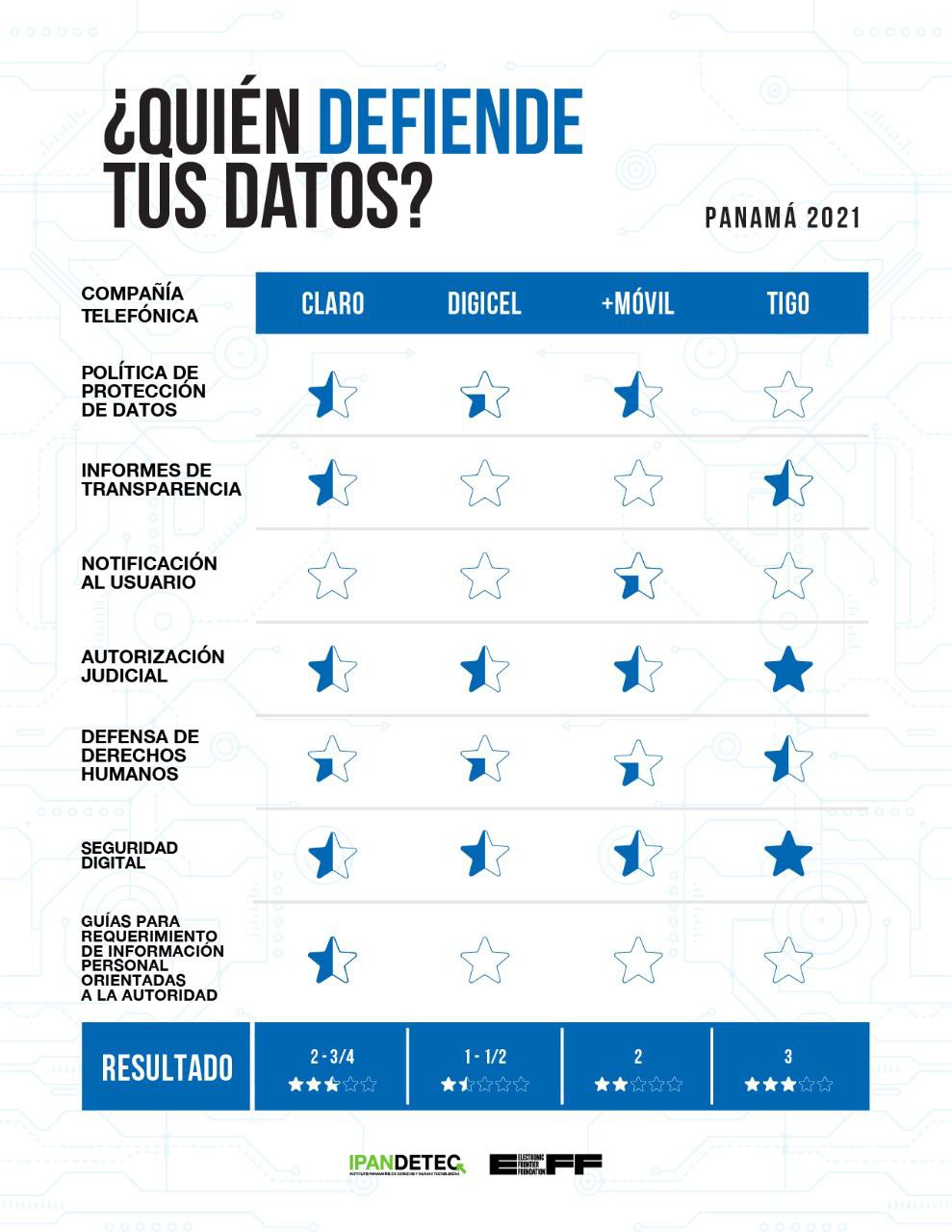 Los proveedores de servicios de Internet móvil de Panamá han mejorado sus compromisos con la transparencia y la privacidad de los usuarios, según la nueva edición de ¿Quien Defiende Tus Datos? de IPANDETEC. La tercera edición, publicada hoy, muestra un progreso general en las políticas de protección de datos de las empresas y su compromiso público de evaluar los fundamentos jurídicos de las solicitudes de las fuerzas de seguridad antes de entregar los datos de los usuarios a las autoridades. Como en la última edición, IPANDETEC evaluó a Claro (América Móvil), Tigo (Millicom), Digicel y Más Móvil en sus políticas y prácticas de privacidad.