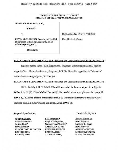 , where we represented 11 plaintiffs in challenging under the First and Fourth Amendments the U.S. government’s practice of conducting warrantless and suspicionless border searches of electronic devices. - Read one of our many amicus briefs: Elsharkawi v. United States (9th Circuit) and United States v. Kamaldoss (2d Circuit).