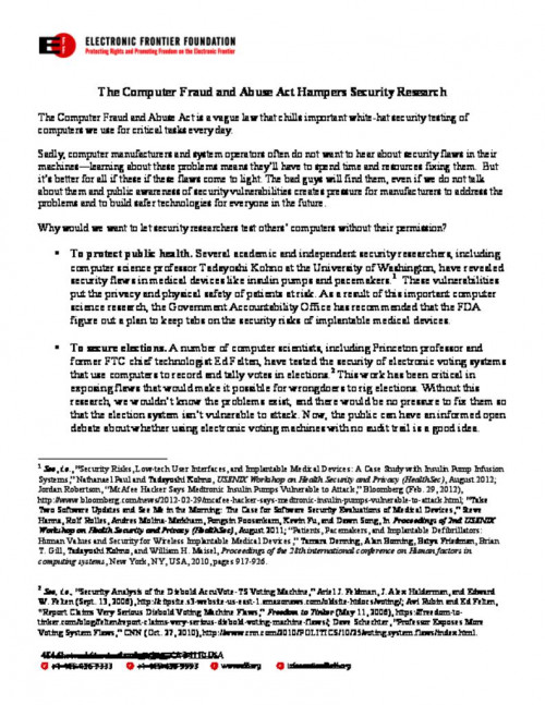After the tragic death of programmer and Internet activist Aaron Swartz, EFF calls to reform the infamously problematic Computer Fraud and Abuse Act (CFAA). In June 2013, Aaron's Law, a bipartisan bill to make common sense changes to the CFAA was introduced by Reps. Lofgren and Sensenbrenner. You can help right now by emailing your Senator and Representative to reform the draconian computer crime law. The CFAA is the federal anti-hacking law. Among other things, this law makes it illegal to intentionally access a computer without authorization or in excess of authorization; however, the law does not explain what "without authorization" actually means. The statute does attempt to define "exceeds authorized access," but the meaning of that phrase has been subject to considerable dispute. While the CFAA is primarily a criminal law intended to reduce the instances of malicious hacking, a 1994 amendment to the bill allows for civil actions to be brought under the statute.