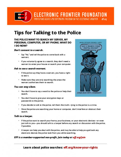 EFF has designed this guide to help you understand your rights if officers try to search the data stored on your computer or portable electronic device, or seize it for further examination somewhere else. Keep in mind that the Fourth Amendment is the minimum standard, and your specific state may have stronger protections.