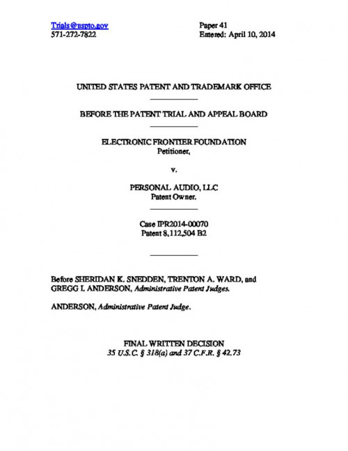 EFF has also filed challenges to certain patents in the form of a "re-examination request" to the U.S. Patent and Trademark Office. These requests create a forum to affirmatively invalidate patents rather than forcing technology users to await the threat of suit. Under this procedure, EFF can choose particularly egregious patents, submit the prior art it has collected, and argue that the patent should be revoked. EFF collaborates with members of the software and Internet communities as well as legal clinics and pro bono cooperating attorneys to help in these efforts.