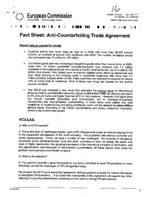 Document | October 23, 2007 European Commission Fact Sheet on ACTA Also contains Pharma Press Release dated 23 Oct 2007 in support of New Agreement Designed to Enforce Anti-counterfeiting Laws Read more about European Commission Fact Sheet on ACTA