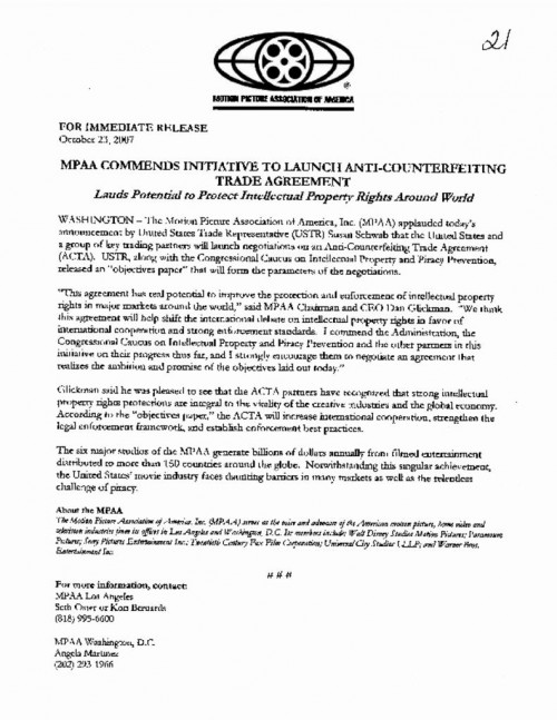 Document | October 23, 2007 MPAA Press Release commending launch of ACTA negotiations Read more about MPAA Press Release commending launch of ACTA negotiations