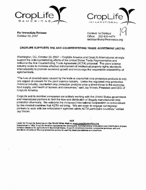 Document | October 23, 2007 CropLife Press Release Supporting ACTA (2nd copy). Also National Association of Manufacturers News Alert/ Press Release on ACTA Duplicate copy of CropLife Press Release - see doc. 11 Read more about CropLife Press Release Supporting ACTA (2nd copy). Also National Association of Manufacturers News Alert/ Press Release on ACTA