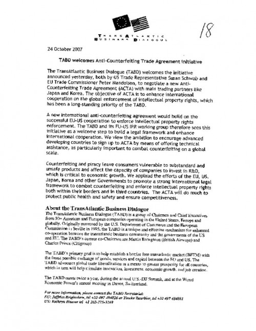 Document | October 24, 2007 TransAtlantic Business Dialogue press release welcoming ACTA Read more about TransAtlantic Business Dialogue press release welcoming ACTA