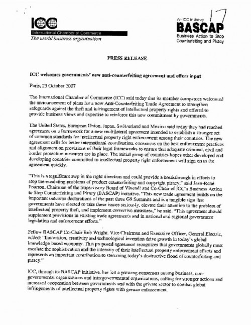 Document | October 23, 2007 ICC- BASCAP Press Release welcoming new Anti-counterfeiting Trade Agreement Read more about ICC- BASCAP Press Release welcoming new Anti-counterfeiting Trade Agreement