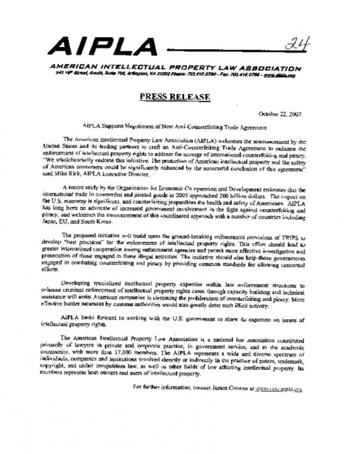 Document | October 23, 2007 AIPLA Press Release Supporting negotiaiton of ACTA Read more about AIPLA Press Release Supporting negotiaiton of ACTA