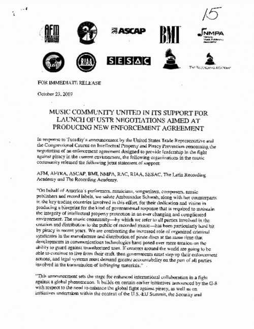 Document | October 23, 2007 Press Release from ASCAP, BMI, SESAC, RIAA, NMPA, AFM, AFTRA, Recording Academy supporting ACTA Negotiation Launch "In addition, today's announcement furthers one of the goals contained in the important Council of Europe Cybercrime Convention which recognized that internet piracy should be a priority for law enforcement."... Read more about Press Release from ASCAP, BMI, SESAC, RIAA, NMPA, AFM, AFTRA, Recording Academy supporting ACTA Negotiation Launch