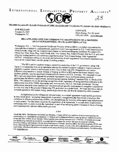 Document | October 23, 2007 IIPA Press Release applauding launch of ACTA negotiations Read more about IIPA Press Release applauding launch of ACTA negotiations