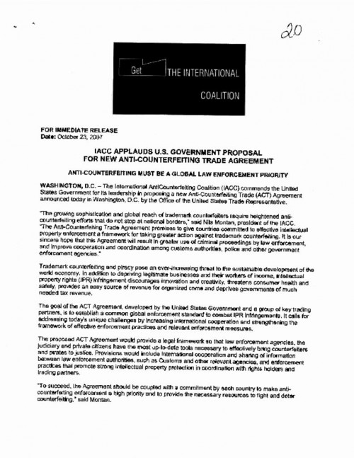 Document | October 23, 2007 IACC Press Release Applauding US Govt Proposal for ACTA International Anti-Counterfeiting Coalition Read more about IACC Press Release Applauding US Govt Proposal for ACTA