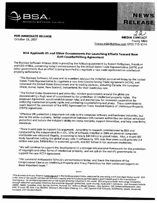 Document | October 23, 2007 BSA Press Release applauding US Govt for launch of ACTA Read more about BSA Press Release applauding US Govt for launch of ACTA