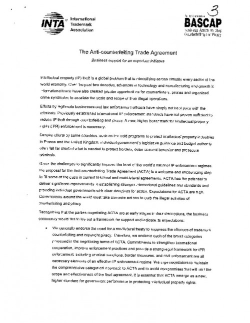 Document | March 3, 2008 INTA-BASCAP views on the Anti-counterfeiting Trade Agreement Read more about INTA-BASCAP views on the Anti-counterfeiting Trade Agreement