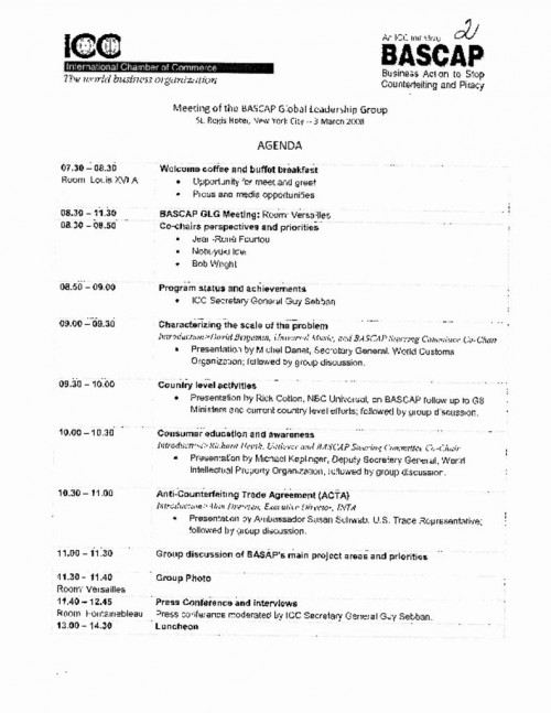 Document | March 3, 2008 Agenda of meeting with BASCAP Global Leadership Group Presentations to BASCAP GLG on ACTA by Ambassador Susan Schwab, on Consumer Education by WIPO's Michael Keplinger.... Read more about Agenda of meeting with BASCAP Global Leadership Group