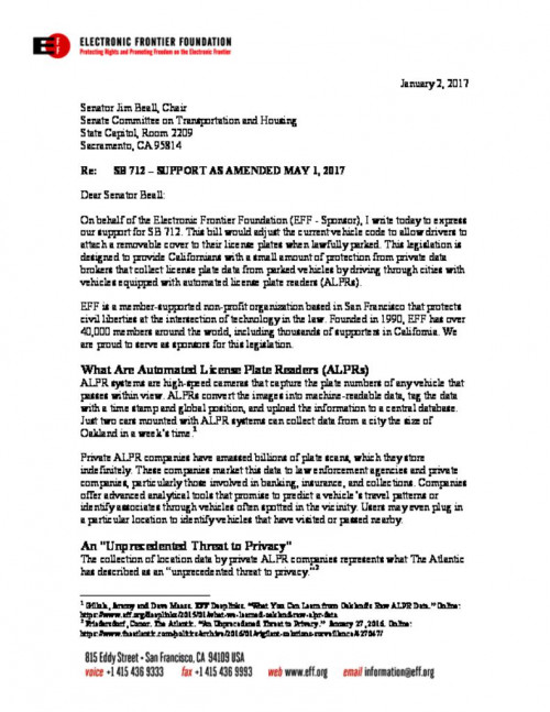The Electronic Frontier Foundation and the ACLU of California joined forces with California State Sen. Joel Anderson (R-Alpine) on Tuesday to testify in favor of S.B. 712, a bill that would have allowed drivers to cover their license plates when parked in order to protect their travel patterns...