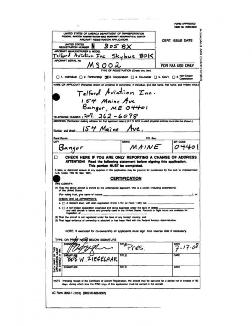 Document | August 9, 2012 TelfordAviation-N805BX Registration Read more about TelfordAviation-N805BX Registration
