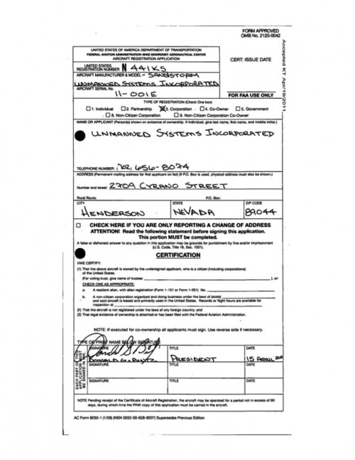Document | August 9, 2012 Unmanned-Systems-Inc_N441KS Registration Read more about Unmanned-Systems-Inc_N441KS Registration