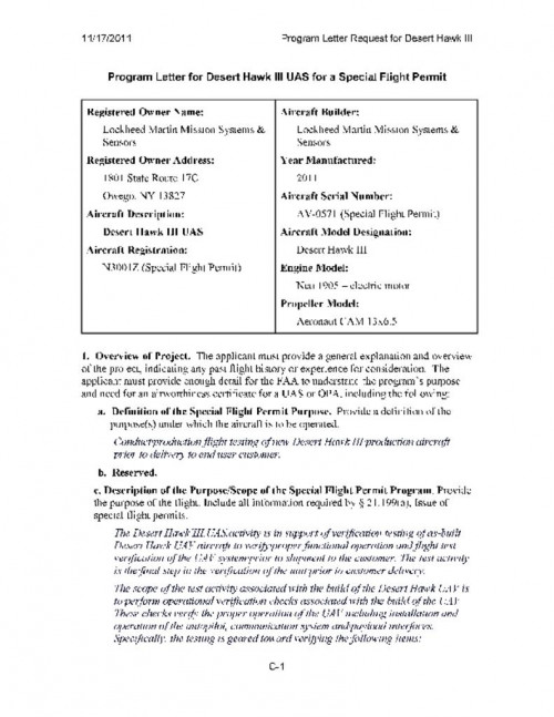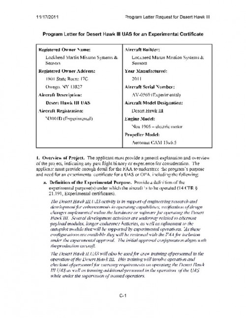 Document | August 9, 2012 LockheedMartin-N3001D-FAA Program Letter for Desert Hawk AV-0569 Read more about LockheedMartin-N3001D-FAA Program Letter for Desert Hawk AV-0569