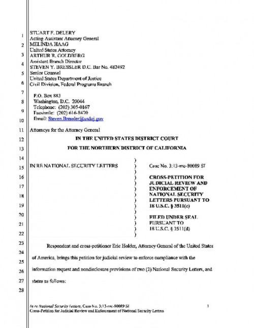 Document | May 22, 2013 Government's Cross-Petition for Judicial Review and Enforcement of NSLs Read more about Government's Cross-Petition for Judicial Review and Enforcement of NSLs