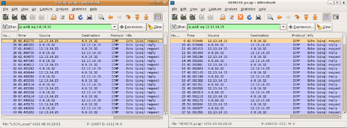 Here, we see how the capture process appears at both ends following a large number of ping requests from 12.13.14.15 to 4.8.16.32. The packets displayed agree one-to-one (as could be verified by looking more closely at the packets' contents than we do here); there are no dropped packets and no spoofed packets. (Note that you can't see this view from both ends in real-time; this screen shot was created after the fact by copying a saved capture file from one computer onto another. While the capture is running, each party sees only one of the two windows displayed here; in order to verify that the packet captures correspond properly while they're in progress, you'll need to use some other means of communication to talk to the person at the other end, such as a telephone or instant messaging application. You'll use this channel to coordinate your activities and to compare notes.)