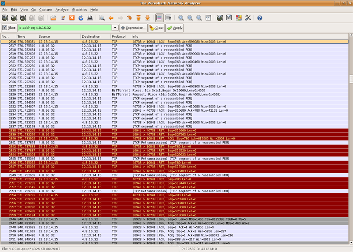 Before the RST packets begin (packet no. 2338 in the local capture and packet no. 2549 in the remote capture 9), the packets transmitted and received correspond directly to one another (although they appear in rather different orders). 10 Once the RST packets begin, a large number of packets are received at each end that do not correspond to packets transmitted at the other end. We can verify this by looking at the detailed contents of these packets (for example, their sequence numbers, which are displayed by Wireshark as Seq=nnnnn), although simply counting them tells the tale in this case. The local machine, with IP address 12.13.14.15, reported transmitting a total of five RST packets to the remote machine at 4.8.16.32 (packet nos. 2340, 2342, 2346, 2350, and 2354), while it reported receiving 13 such packets from 4.8.16.32 (packet nos. 2338, 2339, 2343, 2344, 2347, 2348, 2351, 2352, 2355, 2356, 2357, 2358, and 2359). The remote machine, with IP address 4.8.16.32, reported transmitting only a single RST packet (packet no. 2560) while it believes it received 17 RST packets from 12.13.14.15 (2549, 2550, 2551, 2552, 2553, 2554, 2555, 2556, 2557, 2558, 2561, 2562, 2563, 2564, 2565, 2566, 2567). Evidently, many of the RST packets received by each machine did not actually originate from the other. 11 The result of these RST packets in this case was that the BitTorrent session stopped and did not resume for around four and a half minutes. (A new TCP session is established with the characteristic SYN and SYN/ACK packets at local capture packet nos. 2446 and 2447, which correspond to the remote capture's packet nos. 2578 and 2579.)